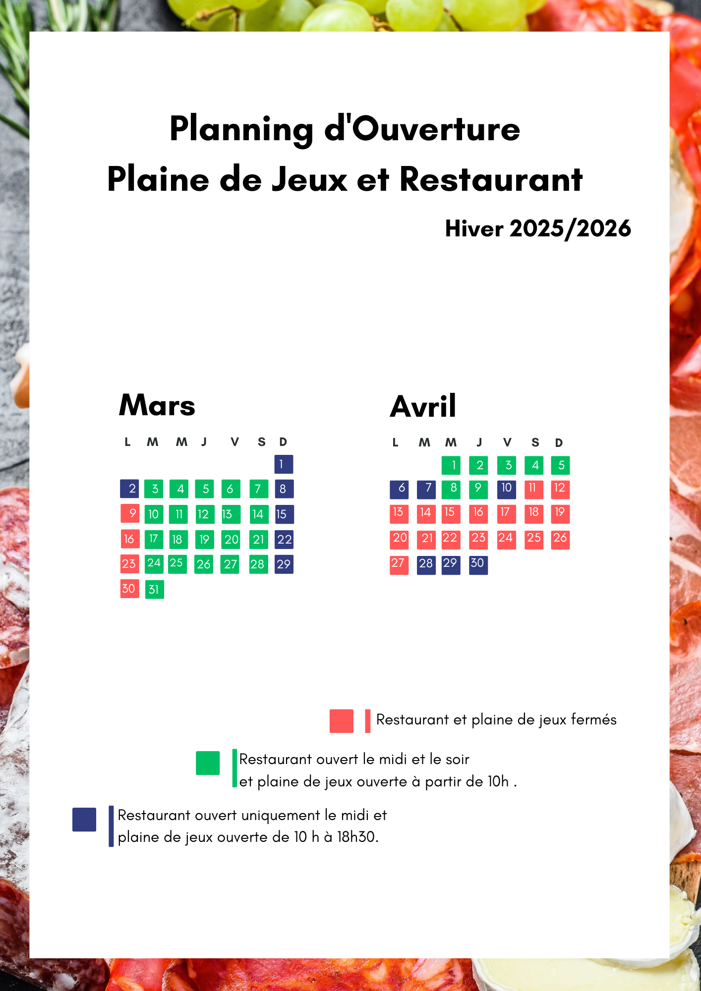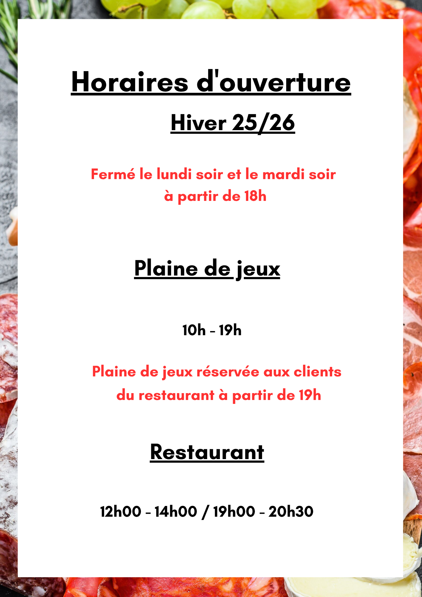 Ouvert midi et soir, notre restaurant propose une cuisine traditionnelle et des plats savoyards. Bien sûr, les plus petits ont possibilité de prendre des menus enfants !